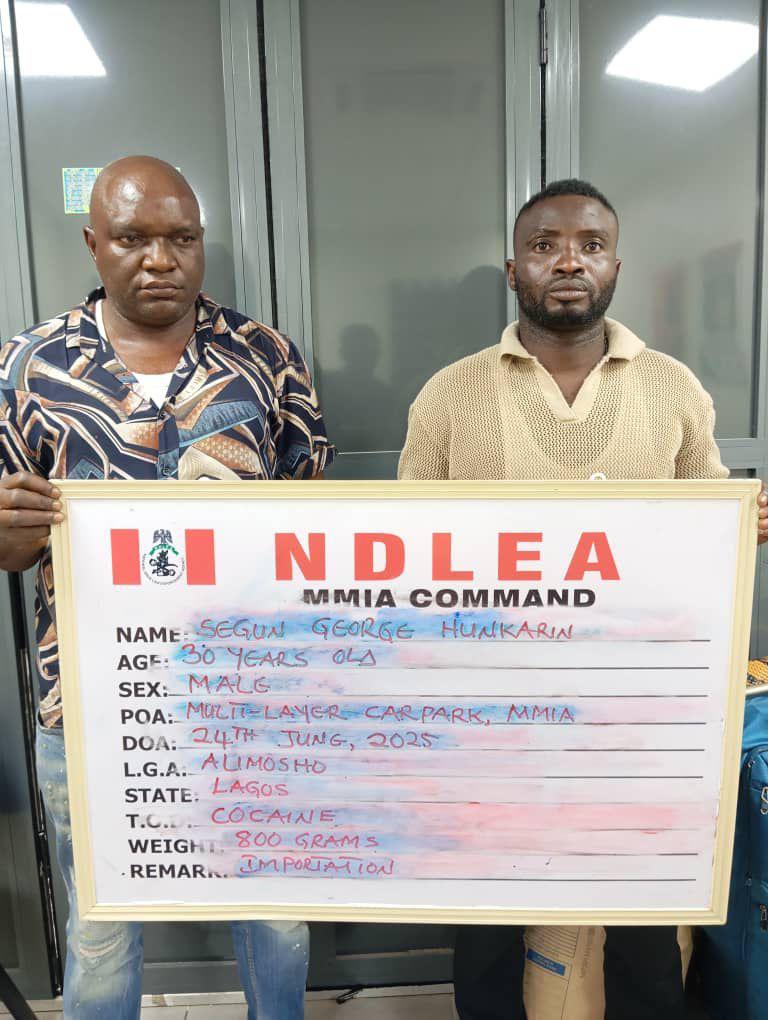Operatives of the National Drug Law Enforcement Agency (NDLEA) have arrested a former football player Segun George Hunkarin along with his businessman partner Ntoruka Chinedu over attempt to smuggle a consignment of cocaine into Nigeria through the Murtala Muhammed International Airport, Lagos.