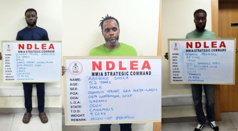 The operatives in a two-week-long intelligence-led operations across parts of Lagos have arrested three leaders of the cartel after intercepting large consignment of cocaine concealed in textile materials and local charms going to Sydney, Australia at the Murtala Muhammed International Airport (MMIA) Ikeja Lagos.