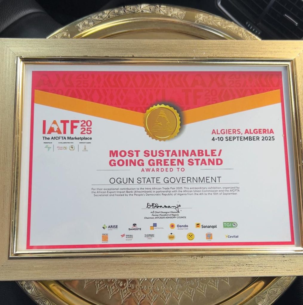 Ogun State, on Wednesday, 10 September, 2025emerged as the winner of the Most Sustainable Going Green Stand award at the Intra-African Trade Fair (IATF) 2025 event held in Algiers, Algeria.